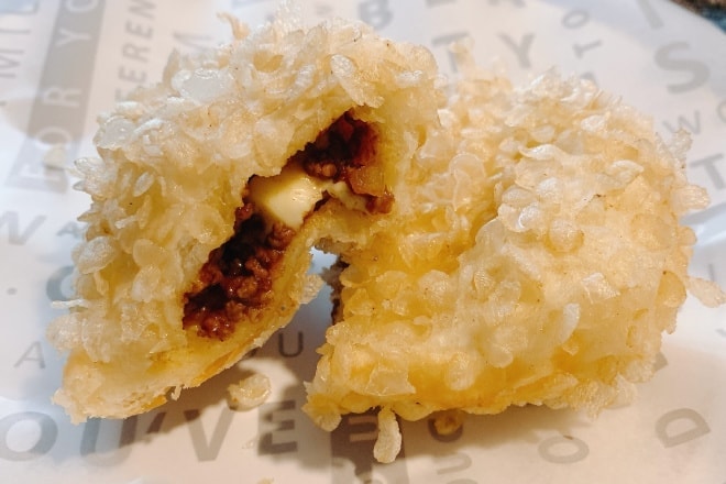 - 13を適度に冷ました後、バッター液を刷毛などでパンの周りに塗り付け、発芽玄米フレークをまぶし、185度程度に温めた油で2分程度揚げて出来上がり。