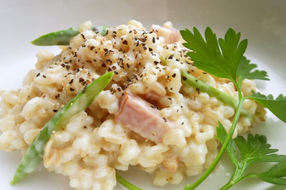 半生発芽玄米 味自慢(静岡県産コシヒカリ)(120g)、カルボナーラソース(2〜3人前用1パック)、ベーコン(適量)、アスパラ(適量)、粗挽き黒ゴマ(少々)、イタリアンパセリなど(お好みで)