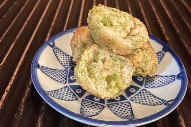 - 180℃の油に、スプーンですくい落して、表面が色づくまで揚げる。