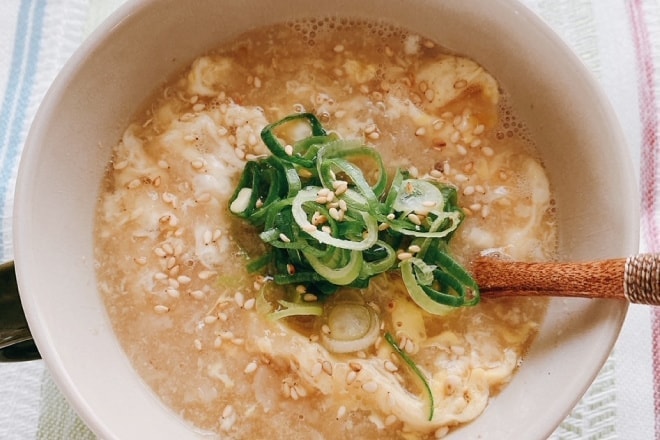 発芽玄米フレークをレンチンで簡単に卵雑炊にしました。