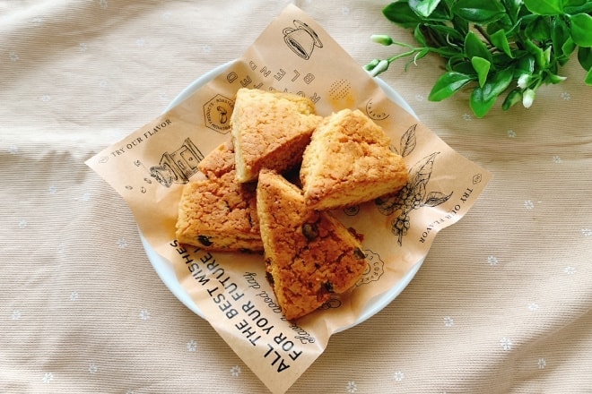 アルファー化発芽玄米粉(60g)、米粉(140g)、ベーキングパウダー(小さじ2)、てんさい糖(50g)、無塩バター(50g)、卵(1個)、牛乳(80cc)