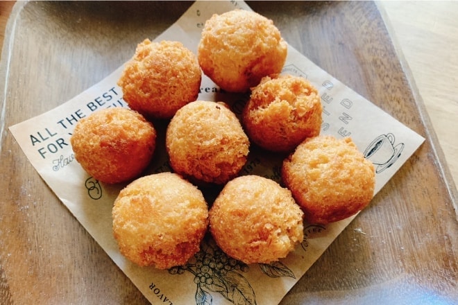 - 形を整えて、180℃の油できつね色になるまで揚げたら完成。※よく油を切り、お好みできな粉や粉砂糖をまぶしてお召し上がりください。