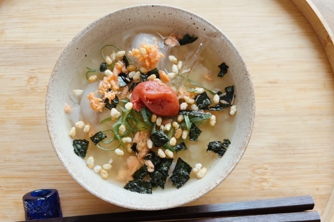 - 容器に●の白だしと水(20cc)、氷を入れて冷やしておく。